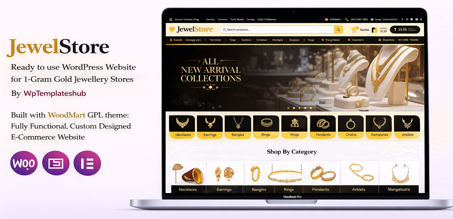 JewelStore – 1Gram Gold Jewellery Ecommerce Website is a modern WordPress ecommerce website template designed for 1 gram gold jewellery stores and imitation jewellery brands. Built with Elementor page builder and WooCommerce, this website includes ready-to-use ecommerce pages, stylish product showcase layouts, responsive design, and easy customization, making it perfect for launching a jewellery store quickly.